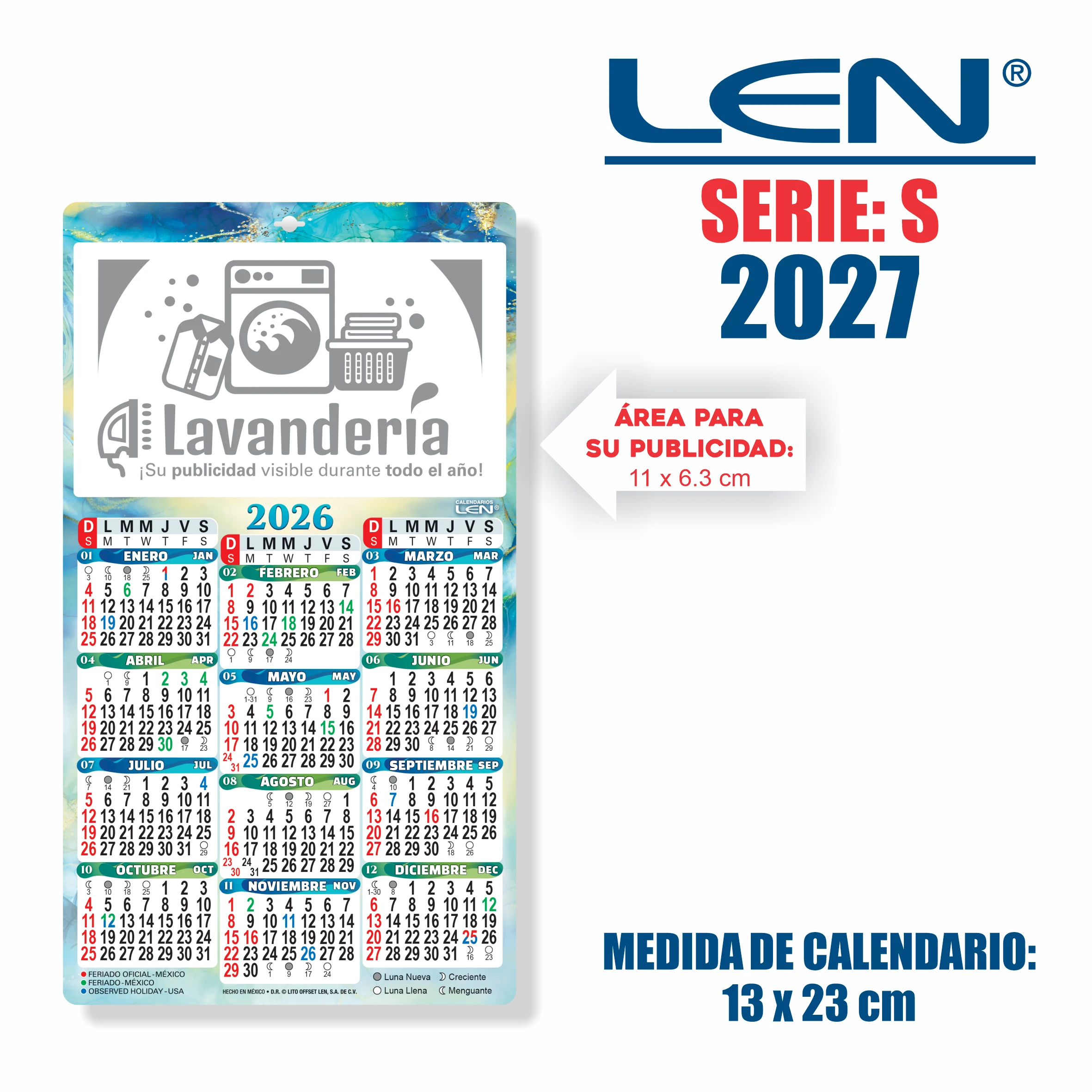Medida del calendario: 13 x 23 cm. Área de publicidad: 11 x 6.3 cm.