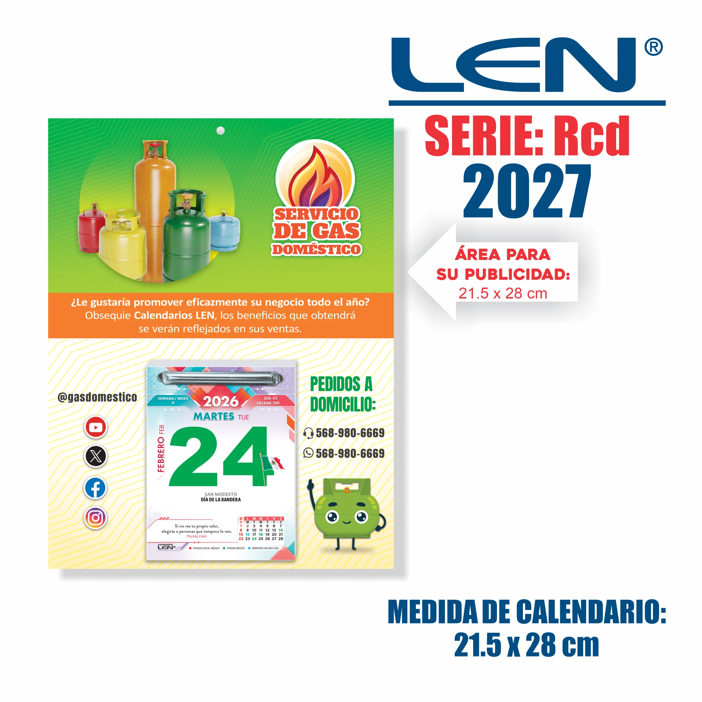 Calendario exfoliador respaldo de carton digital Len. Medida: 21.5 x 28 cm. Área de publicidad: 21.5 x 28 cm.