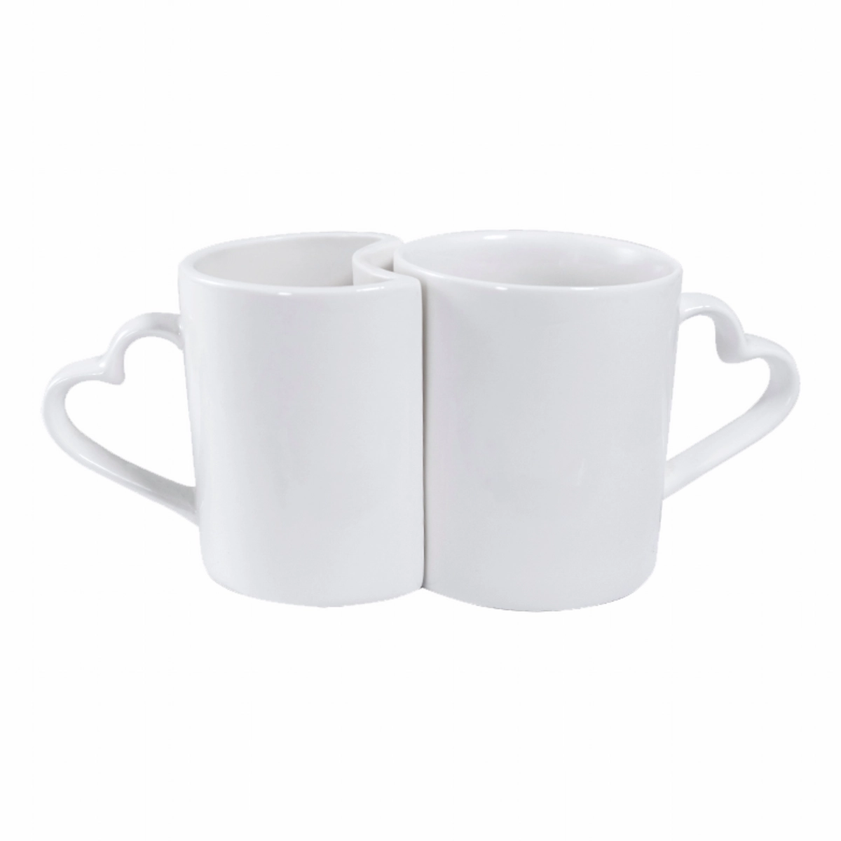 Taza de pareja con diseño complementario y asa de corazón, apta para sublimación.