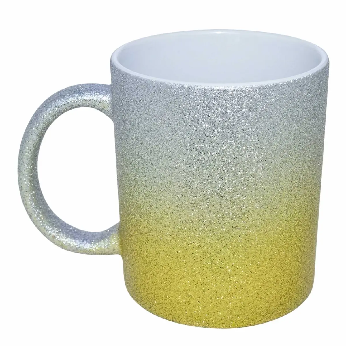 Taza con acabado glitter en combinación bicolor, apta para sublimación.