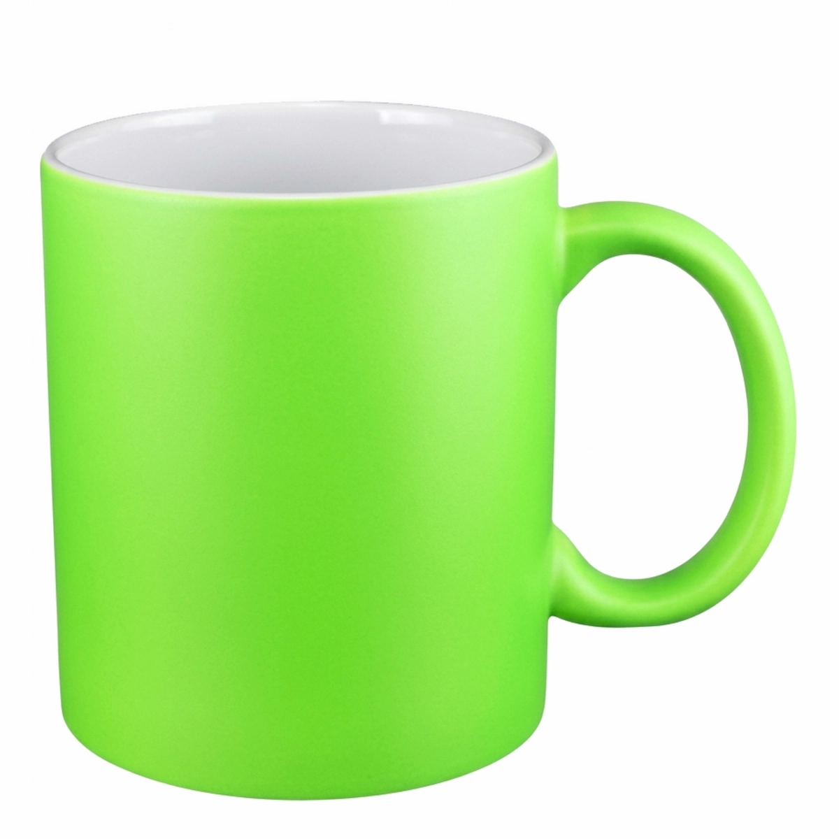 Taza sublimable de 11 oz con acabado fluorescente para diseños llamativos.