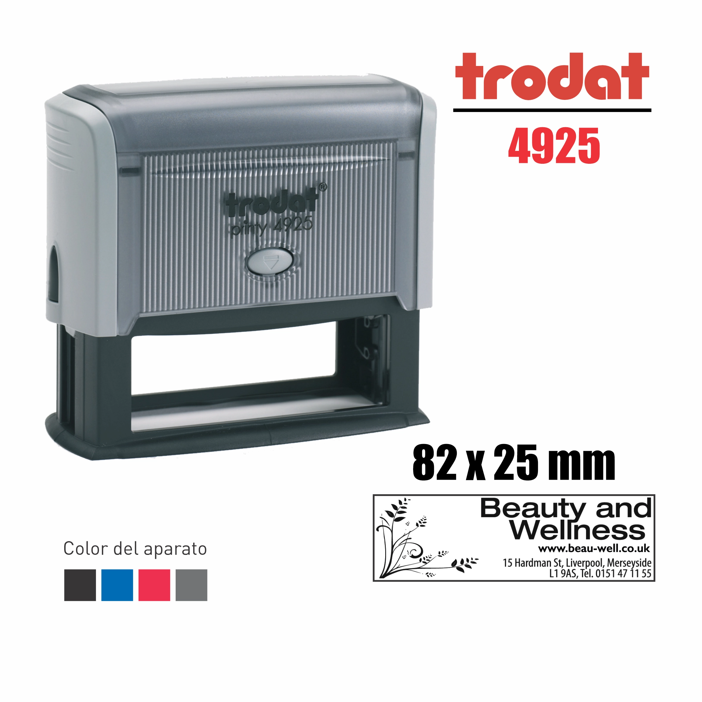 Sello de texto autoentintable Trodat Printy 4925. Tamaño: 82 x 25 mm. Personalizable.