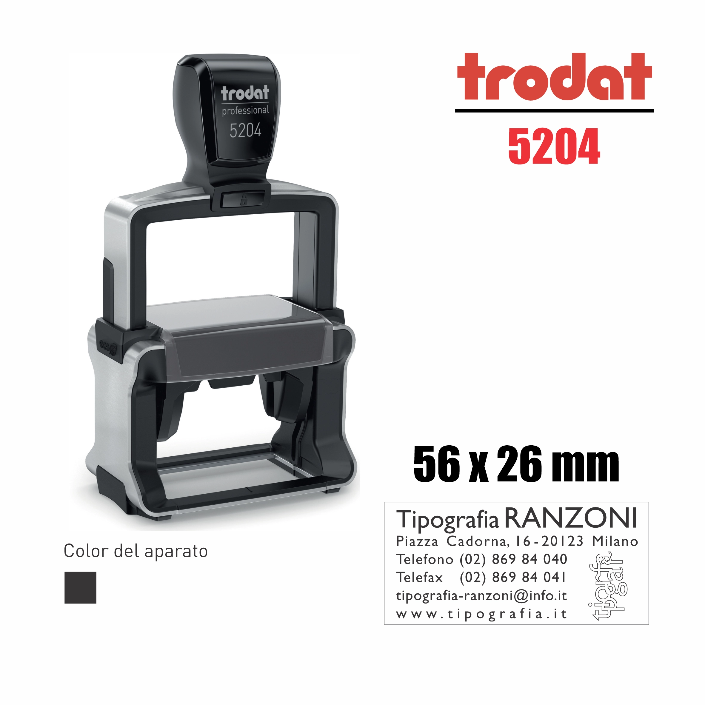 Sello de texto autoentintable Trodat Professional modelo 5204, área máxima de impresión 56 x 26 mm, ideal para uso frecuente en oficina con marcadas limpias y precisas.