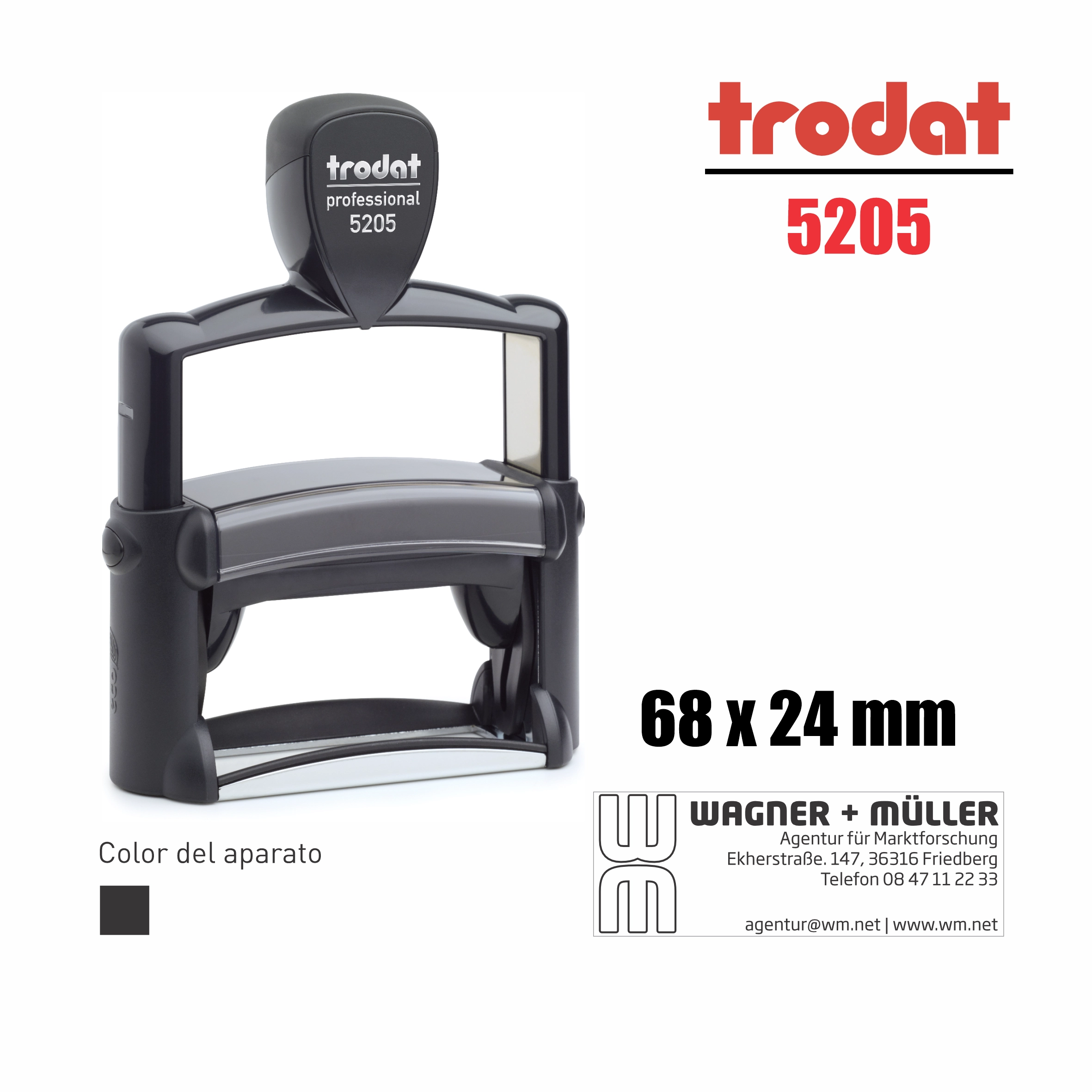 Sello de texto autoentintable Trodat Professional modelo 5205, área máxima de impresión 68 x 24 mm, ideal para uso frecuente en oficina con marcadas limpias y precisas.
