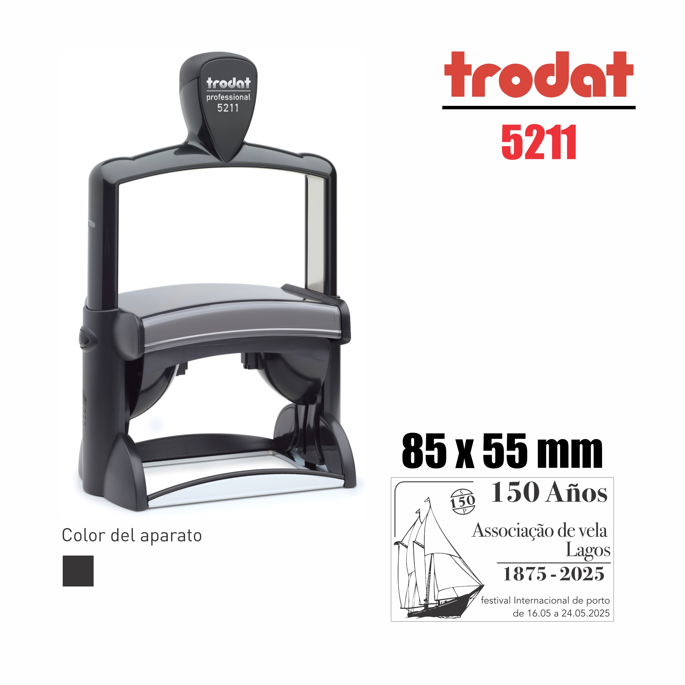 Sello de texto autoentintable Trodat Professional modelo 5211, área máxima de impresión 85 x 55 mm, ideal para uso frecuente en oficina con marcadas limpias y precisas.