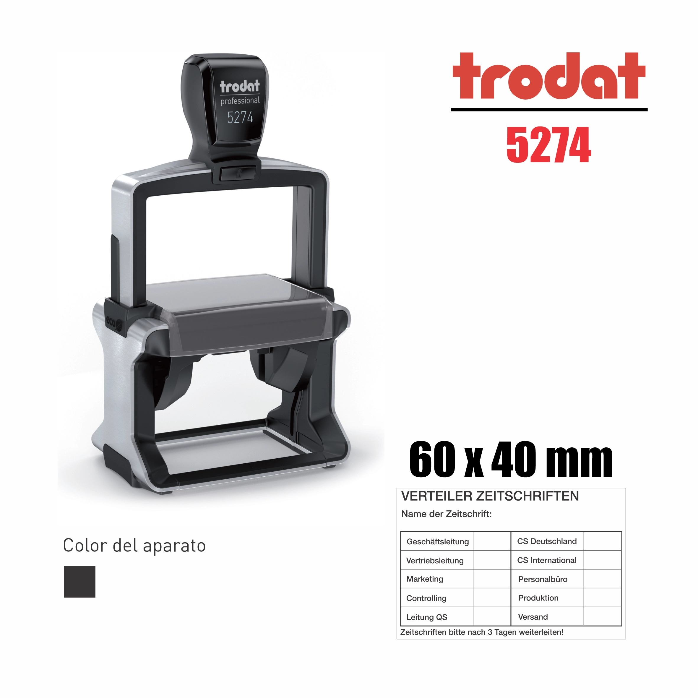 Sello de texto autoentintable Trodat Professional modelo 5274, área máxima de impresión 60 x 40 mm, ideal para uso frecuente en oficina con marcadas limpias y precisas.